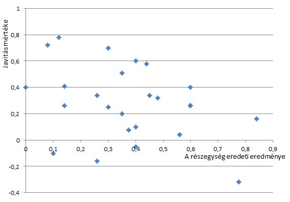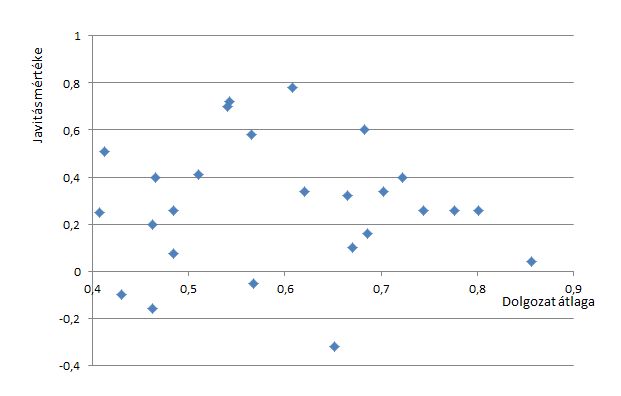 Lássuk az eredményeket! Számomra a legfontosabb, hogy senki nem bukott meg az epochában. A diákok átlagosan 28,8 százalékpontot javítottak az adott részegységből (a szórás 27,3 volt). Az alábbi két grafikon azt mutatja, hogy miként függ össze az adott részegységből elért eredmény és a javítás mértéke, valamint az eredeti dolgozat átlageredménye és javítás mértéke. Jól látszik, hogy nincsen nagyon szoros összefüggés az értékek között, nem igaz tehát, hogy a jó vagy a rossz tanulók javítottak volna jobban. Érdekes, hogy három tanuló úgy döntött, nem él a javítás lehetőségével, az ő eredményük a jó kategóriában volt , tehát nem a legrosszabbak és nem a legjobbak voltak.