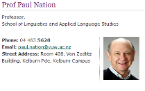 Paul Nation a szókincstanulás kutatásának egyik kiemelkedő élő legendája. Ma az ő oldalán néztünk körül, és hatódtunk meg, hogy mennyi mindent oszt meg ő is a kutatók közösségével. Ezek a programok, illetve letölthető dokumentumok elsősorvban - ám nem kizárólag! - kuatóknak lehetnek érdekesek. Letölthetjük például a