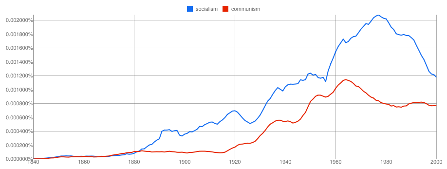 Az első ábrán a szocializmus és a kommunizmus szavak előfordulásának változása látható az angol könyvekben (ITT):