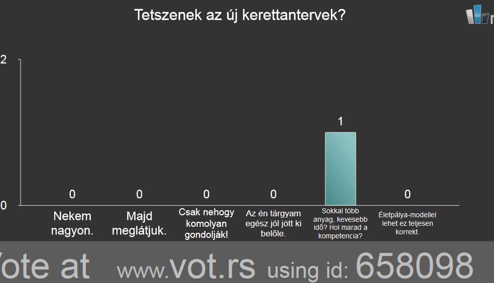 Érdekes alkalmazásnak tűnik a Vot.rs nevű oldal (ITT TALÁLHATÓ), ahol elsősorban előadásokon tudunk azonnali visszajelzést kérni a hallgatóságtól. Egy fél perces regisztrációt követően lehet szavaztatni a közönséget. A folyamat a következő: regisztrálunk a cikk elején megadott oldalon. Itt a 'Create question' elé beírjuk a kérdésünket (tud magyarul!). Ezután magadjuk a válaszlehetőségeket az 'Enter the alternatives' nevű mezőkbe. Következő lépésként válasszunk a két séma közül (fekete-színes, vagy üzleti fehér), és kattintsunk a 'Start presenting' gombra. Most megjelenik a szavazás. A közönség úgy tud bármilyen eszközről szavazni, hogy a) ellátogat a Vot.rs oldalra, és b) ott beírja az oldal alján található ID számot. Ha például az új kerettantervről szeretnénk szavazni, akkor a Vot.rs oldalon a 65 80 98-as azonosítóval ellátott szavazáson fejtheti ki mindenki a véleményét. Érdemes kipróbálni, hátha megtetszik, és elég egyszerű használni. A lapozás után egy képet is mutatunk arról, hogy fog kinézni az előadó oldaláról a szavazás.