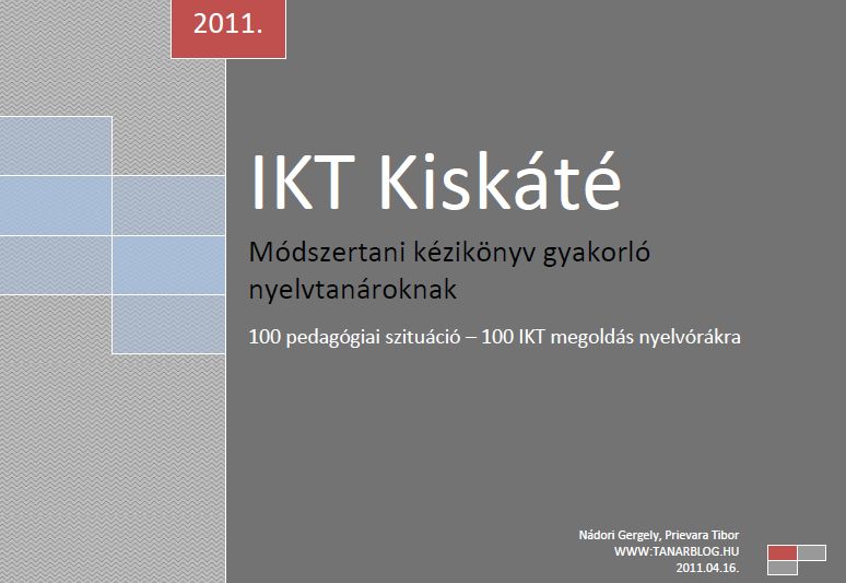 Az IKT kiskáté - nyelvtanároknak (IDE KATTINTVA) a nyelvtanároknak szól. 100 izgalmas helyzet és ugyanennyi IKT megoldás sorakozik benne. A könyv a Nyelviskolák Szakmai Egyesületének támogatásával született meg.