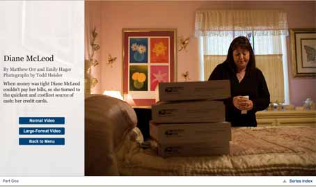 The Dept Trap (IDE KATTINTVA érhető el). A The New York Times üzleti oldalain található ez a remek interaktív játék (nem is játék, inkább remek multimédiás, interaktív bemutató). A koncepciója nagyon egyszerű: egy-egy mondatot találhatunk, ahol a szavak helyenként linkek. A linkek mögé nézve cikkek, videók, fényképek segítségével tájékozódhatunk tovább. Rengeteg hasznos, intelligensen rendszerezett információ található a NY Times oldalán, a fenti képen éppen egy videó látható, amelyben egy középkorú családanya meséli e, hogy az ő életére milyen hatással volt a (van) a hitelválság.