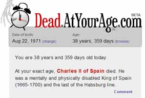 A Dead at your Age nevű oldal - bár valóban elég morbid - mégis furcsa módon megnyugtat. A lényege annyi, hogy meg kell adnunk születési dátumunkat (természetesen nem KELL a saját adatainkat berni, azaz helyesen fogalmazva: meg kell ednunk EGY születési dátumot), majd megadott gombra kattintva megtudhatjuk, kik is azok a világtörténelemben, akiket már túléltem (ki hinné, hogy már most két hete vertem pl. Charlotte Brontë-ra :-) Azért ez is valami ... Külön érdekesség, hogy az adatok mellé kis történeteket is kapunk, így magtudhatjuk azt is, hogy ki miben, mikor, miért halt meg.