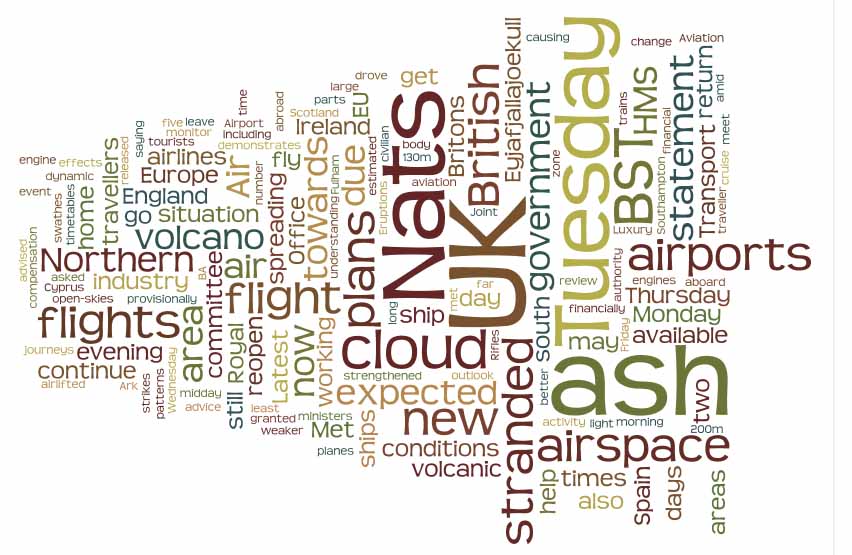 2. Nyissuk ki a számítógépeket (két gyereknek elég 1 gép), és látogassunk el a Wordle oldalára. Itt mondjuk el a diákoknak, hogy címkefelhőket készítenek majd aktuális hírekből, a feledatuk az lesz, hogy a címkefelhő alapján találják ki, hogy miről szólhat a hír. Ha ez nehéznek tűnik, illusztráljuk előbb. Íme egy címkefelhő, amelyet egy, az izlandi vulkánkitörésről szóló BCC cikk alapján készítettem (a képre kattintva lehet a Wordle oldalán megnézni):