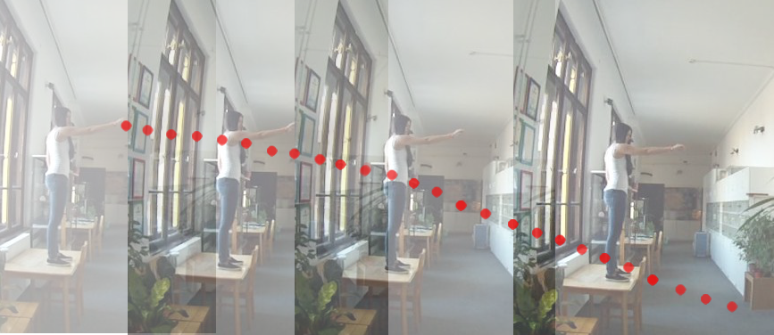 Minden képet az előzőtől 15 pixellel jobbra tettünk le. A következő lépésként a képek fölé egy új szintet hoztunk létre és ezen bejelöltük a labdák helyét mindegyik képen. Hogy jobban látható legyen, mi is történik, csak pár képet hagytunk meg és ezek áttetszőségét is levettük. Az eredmény itt látható: