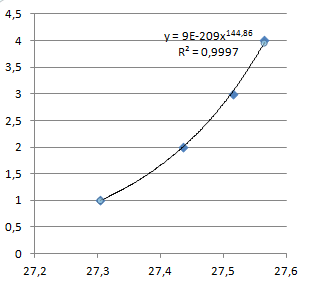 A leolvasott időtávokat ezután Excelben ábrázoltuk grafikonon és (ahogyan reméltük is) parabolát kaptunk. Ilyet: