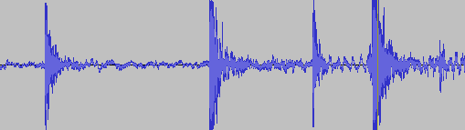 Ekkor jött az ötlet, hogy használjunk egy mikrofont az idő mérésére. Egy spárgára kötöttünk csavarokat egyenlő távolságokban, elégettük a spárgát és mrögzítettük a koppanások hangját. Szabad füllel persze ez még nem igazolja, hogy a szabadesés egyneletesen változó mozgás, de itt jött segítségünkre a számítógép. A felvett hangot betöltöttük az ingyenes Audacity szoftverbe (INNEN LETÖLTHETŐ) és megnéztük, hol vannak a csúcsok, ez a program ezredmásodperces pontosággal adja meg a koppanűsok idejét. Ezt láttuk: