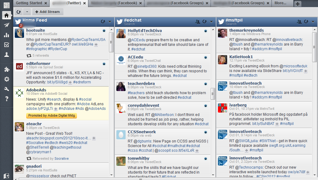 Vannak, akiket követek a Twitteren és persze néhány kulcsszót (hashtaget) is szemmel tartok, jönnek a Facebook státuszfrissítések és ott is tagja vagyok pár csoportnak, közben jó lenne egy-két blogot is figyelni, hogy mi az érdekesség, az újdonság, ezeket esetleg RSS-ben követem. Persze vannak olyan diákcsoportok is, amikkel Facebookon (is) tartom a kapcsolatot. Nem véletlen, ha valaki úgy érzi, ennyi minden elárasztja. A HootSuite nevű oldal (IDE KATTINTVA) abban segít, hogy kiigazodjunk ebben az információáradatban.